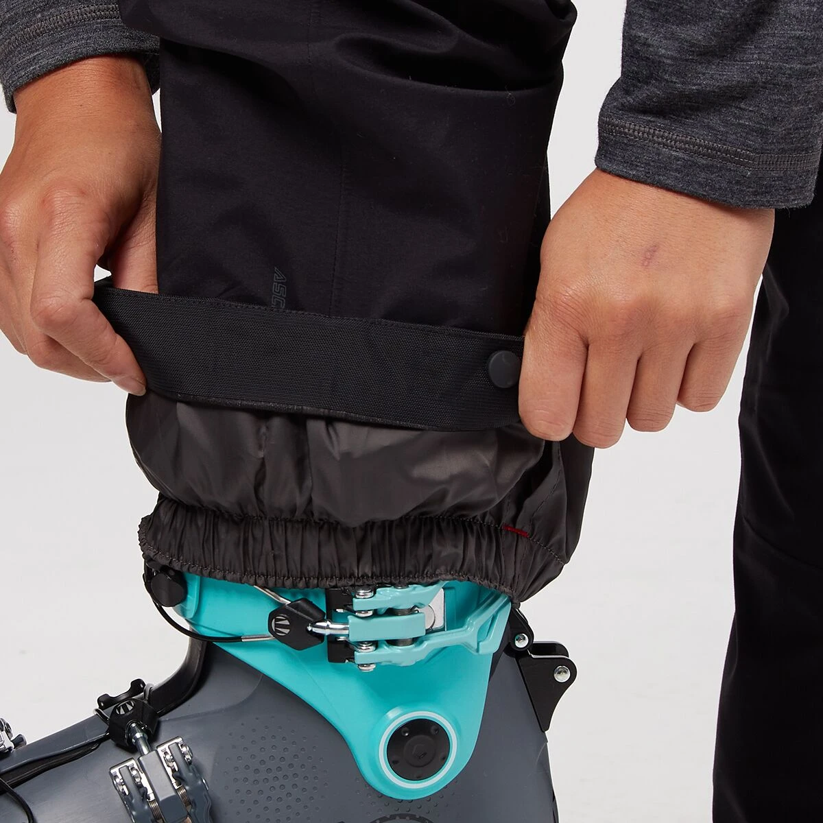 We pull on the Skytour AscentShell Bib to keep cool on the skin track and protected in the white room. The lightweight construction breathes and flexes with us, while the articulated knees and gusseted crotch increase range of motion for executing kick turns. On the descent, the wind-resistant, waterproof membrane keeps us dry and temperate as we find our line through trees.